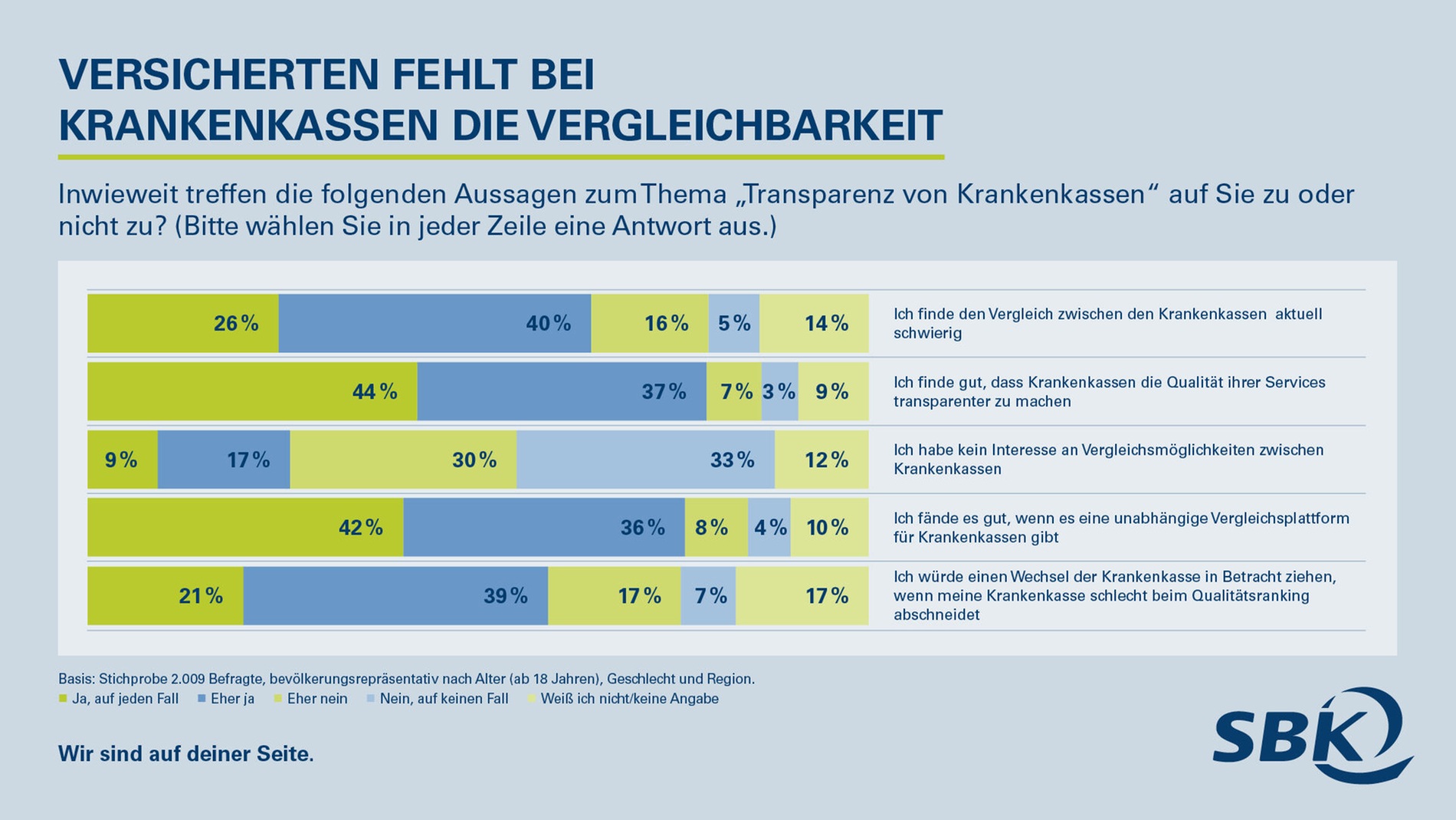 „Die Versicherten geben allen Krankenkassen hier einen klaren Auftrag,“ kommentiert Dr. Gertrud Demmler, Vorständigen der SBK, die Ergebnisse der Umfrage. „Sie wünschen sich Einblicke in das tatsächliche Agieren einer Kasse – sowohl über Kennzahlen als auch über die Erfahrungen anderer Versicherter. Unser Ziel als Kassengemeinschaft muss es sein, den Qualitätsvergleich so einfach wie den Preis-/Leistungsvergleich zu gestalten.“