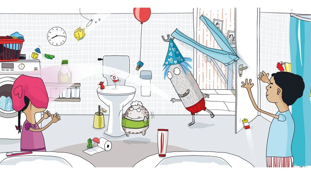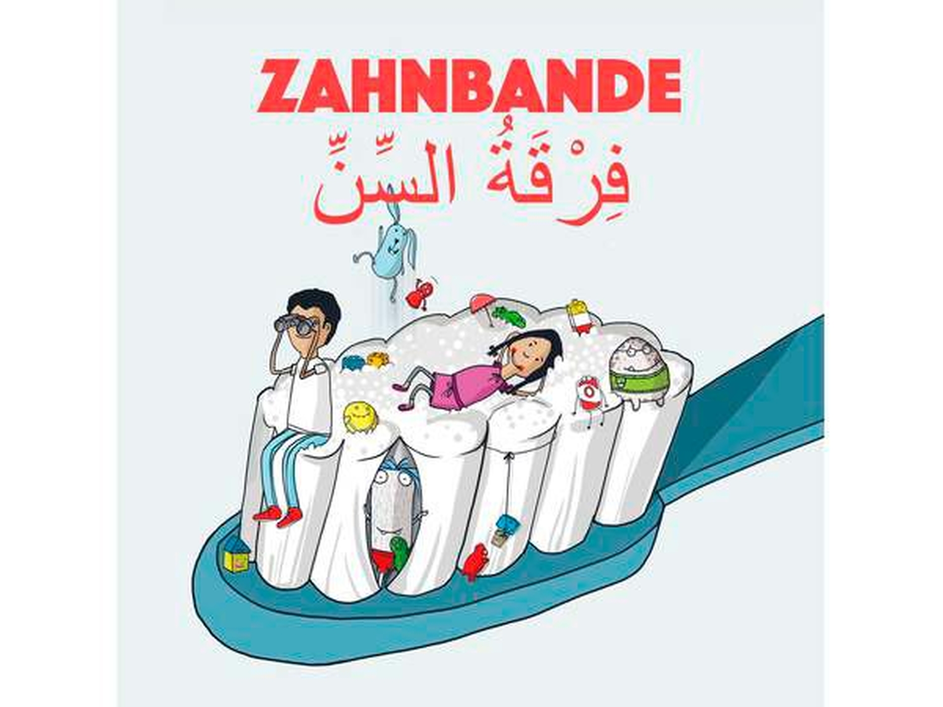 Ein Tag im Leben der Zahnbande: Lebendige Spielzeuge begleiten zwei Geschwister durch den Tag. Sie helfen beim Aufwachen, toben gemeinsam durch das Badezimmer, stöbern im Supermarkt und feiern eine große Party. Dabei achten zwei Monster besonders auf das Zähneputzen. Auch ein Besuch beim Zahnarzt darf nicht fehlen. Am Ende des https://www.prodente.de/addons/broschueren/kinderbuch.html#c3027 - - "zum Kinderbuch \\"Zahnbande" (mit einem Titel auf Deutsch und Arabisch) steckt ein wasserfester Streifen. Die Leser können ihn in den Zahnputzbecher stecken oder auch auf den Badezimmerspiegel aufkleben.