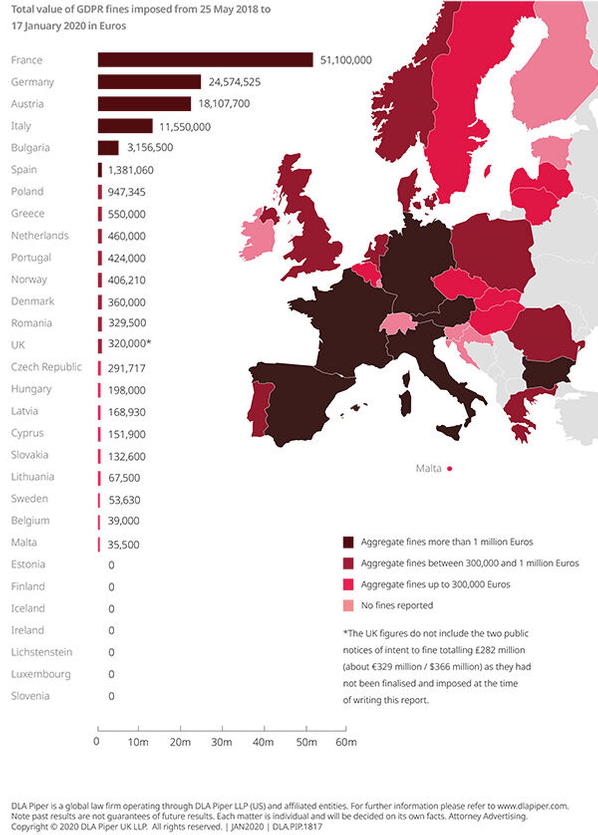Seit Inkrafttreten der Datenschutz-Grundverordnung (DSGVO) im Mai 2018 wurden laut Bericht in den 28 EU-Mitgliedsländern plus Norwegen, Island und Liechtenstein insgesamt bisher rund 160.000 Verstöße gemeldet. Das hat die Kanzlei DLA Piper ausgerechnet. Europäische Datenschutzbeauftragte hätten dabei Strafen im Gesamtwert von 114 Millionen Euro verhängt.