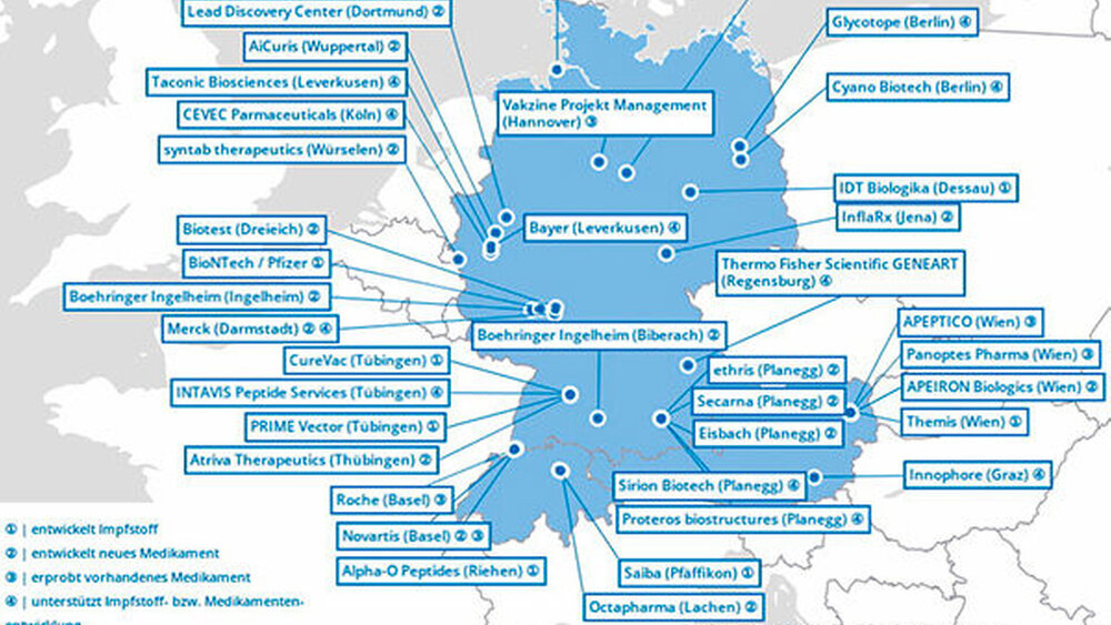 Die Karte beruht auf Recherchen des Verbandes Forschender Arzneimittelhersteller (vfa), BIO Deutschland, PHARMIG und Interpharma (Schweiz) sowie Meldungen der beteiligten Unternehmen und Medienberichten, meldet der vfa. Sie werde laufend ergänzt und aktualisiert, erhebe aber keinen Anspruch auf Vollständigkeit.
