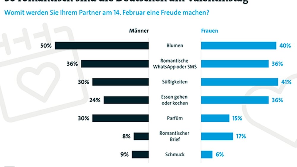 Genau anders herum ist es mit romantischen Briefen, die insgesamt 13 Prozent der Befragten verfassen wollen, jedoch nur 8 Prozent der Männer und 17 Prozent der Frauen. Schmuck ist für 7 Prozent am Valentinstag das Geschenk der Wahl. Die Befragten konnten mehrere Optionen angeben.