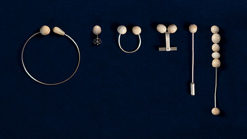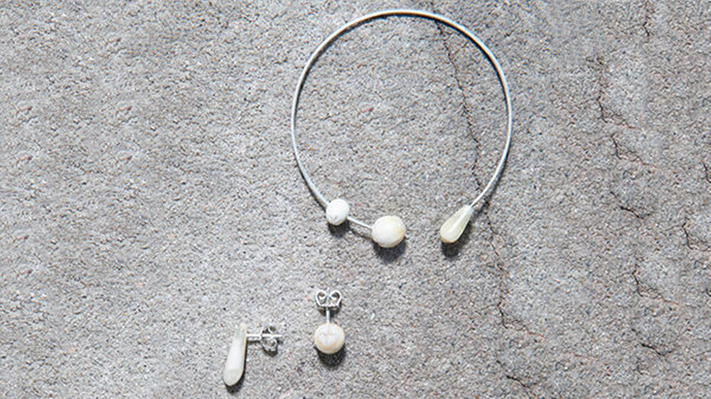 Früher habe ich alle Zähne verwendet: Unsere Molaren sind groß genug, um daraus Perlen in allen möglichen Formen anzufertigen, und da Schneidezähne länger sind, eignen sie sich für tropfenartige Formen. Ich reinige die Zähne in Bleichmittel, bevor ich sie mit einem Steinpoliermaschine glätte. Löcher repariere ich - wie ein Zahnarzt - mit einem weißen Füllstoff. Inspiriert von der japanischen Philosophie über die Schönheit des Unvollkommenen spiele ich mit dem Gedanken, dass wir noch schöner durch unsere eigene Unvollkommenheit werden. Eine Perle ist nach wie vor schön, wenn sie eine sichtbare Reparatur aufweist.