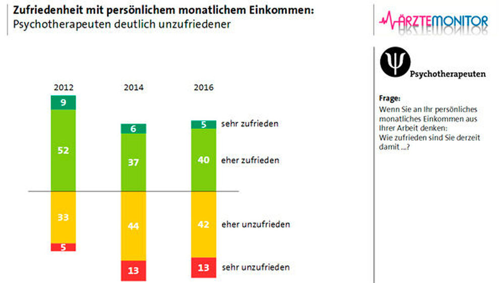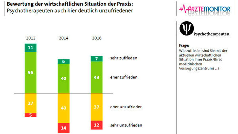 Die Psychotherapeuten sind dagegen deutlich unzufriedener mit ihrem monatlichen Einkommen und der wirtschaftlichen Situation ihrer Praxis. In diesem Jahr waren 45 Prozent mit ihrem Einkommen zufrieden (2012: 61 Prozent). Auch mit der wirtschaftlichen Situation der Praxis waren nur 50 Prozent zufrieden. 2012 waren es noch 67 Prozent.