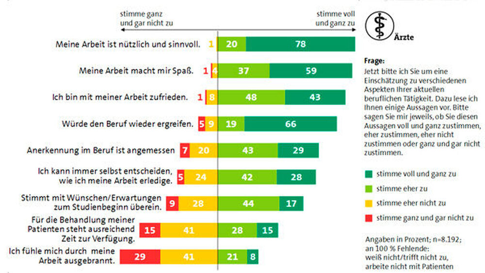 In diesem Jahr geben 95 Prozent der Haus- und Fachärzte sowie 98 Prozent der Psychotherapeuten in Deutschland an, Spaß an ihrem Beruf zu haben. Bei einer durchschnittlichen Wochenarbeitszeit von 52,2 Stunden und 44,6 Patienten am Tag fühlen sich allerdings fast 30 Prozent der befragten Haus- und Fachärzte durch ihre Arbeit ausgebrannt.