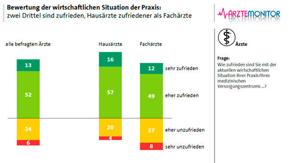Laut der Befragung hat sich die wirtschaftliche Situation der Arztpraxen seit 2012 stetig verbessert. Demnach sind 73 Prozent (2012: 61 Prozent) der Hausärzte mit der Wirtschaftlichkeit der eigenen Praxis zufrieden. Unter den Fachärzten kommen nur 61 Prozent (2012: 55 Prozent) zu diesem Schluss.