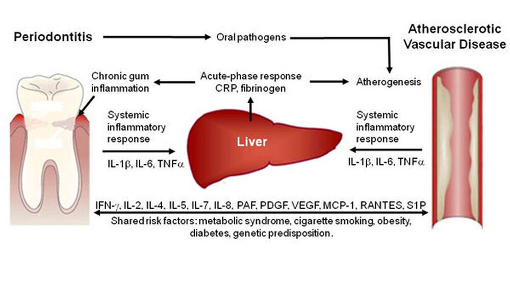 Parodontitis könnte auch eine kausale Rolle bei der Entstehung von Herz-Kreislauferkrankungen spielen, indem die lokale Entzündung des Parodontiums eine systemische Entzündung verstärkt, die sich negativ auf die Gefäßgesundheit auswirkt, indem sie die Atherosklerose stimuliert und dadurch Herz-Kreislauferkrankungen begünstigt. Die Abbildung zeigt ein Modell, das die möglichen Interaktionen zwischen Parodontitis und der Atherosklerose – der Hauptursache für Herz-Kreislauferkrankungen – schematisch darstellt [3].