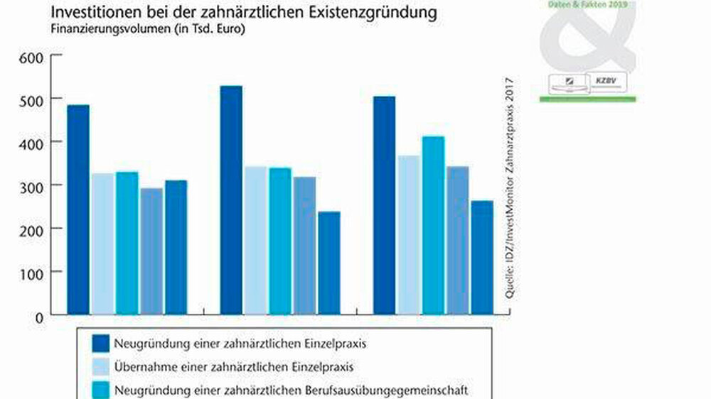 Die am wenigsten kostenintensive Art, 2017 freiberuflich als Zahnarzt zu arbeiten, lag mit 263.000 Euro Investitionsvolumen darin, in eine zahnärztliche Berufsausübungsgemeinschaft einzutreten (2016: 238.000 Euro, 2015: 310.000 Euro).