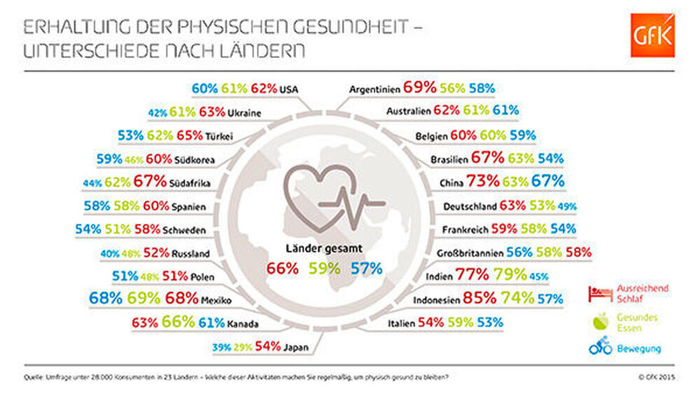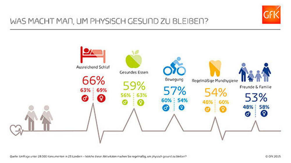 Die Gesellschaft für Konsumforschung (GfK) in Nürnberg fragte Frauen und Männer weltweit: Welche Aktivitäten unternehmen Sie regelmäßig, um physisch gesund zu bleiben? Am häufigsten nannten die Befragten ausreichend Schlaf, gefolgt von gesundem Essen und Bewegung.