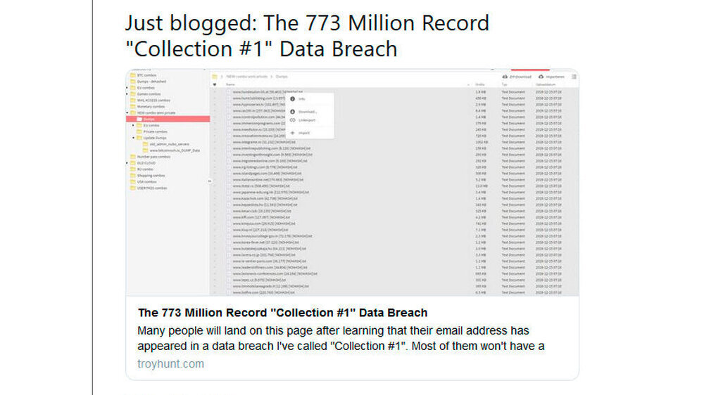 In dem Datensatz mit dem Namen "Collection #1" befinden sich 773 Millionen unterschiedliche E-Mail-Adressen und 21 Millionen verschiedene Passwörter. Dies ergibt insgesamt eine Milliarde Kombinationen. Alle Passwörter liegen Hunt zufolge im Klartext vor .