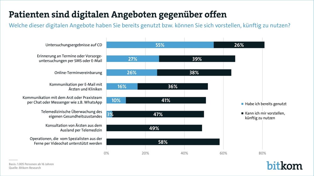 So vereinbaren 26 Prozent schon heute ihre Termine online, acht Prozent der Befragten können sich dies vorstellen. 41 Prozent kommunizieren bereits per WhatsApp oder Chat mit dem Arzt oder seinem Praxisteam; jeder Zehnte hat ein solches Angebot in der Realität schon einmal genutzt.