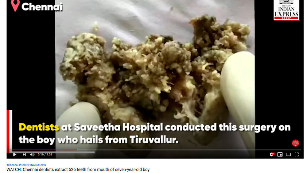 Wie der "New Indian Express" meldet , hatte der Junge eine größer werdende Schwellung einseitig im Unterkiefer bemerkt. Im CT konnte eine große, tumorartige Struktur mit multiplen, zahnähnlichen Gebilden dargestellt werden. In Intubationsnarkose wurde daraufhin der 200 Gramm schwere Tumor entfernt. Insgesamt 526 einzelne Zahnfragmente von 0,1 bis 15 Millimeter Länge befanden sich in einer weichgewebigen, kapselähnlichen Einbettung. Aus dem vorliegenden Pressebericht geht die Tumor-Diagnose nicht hervor.