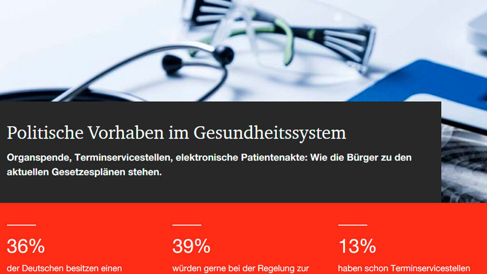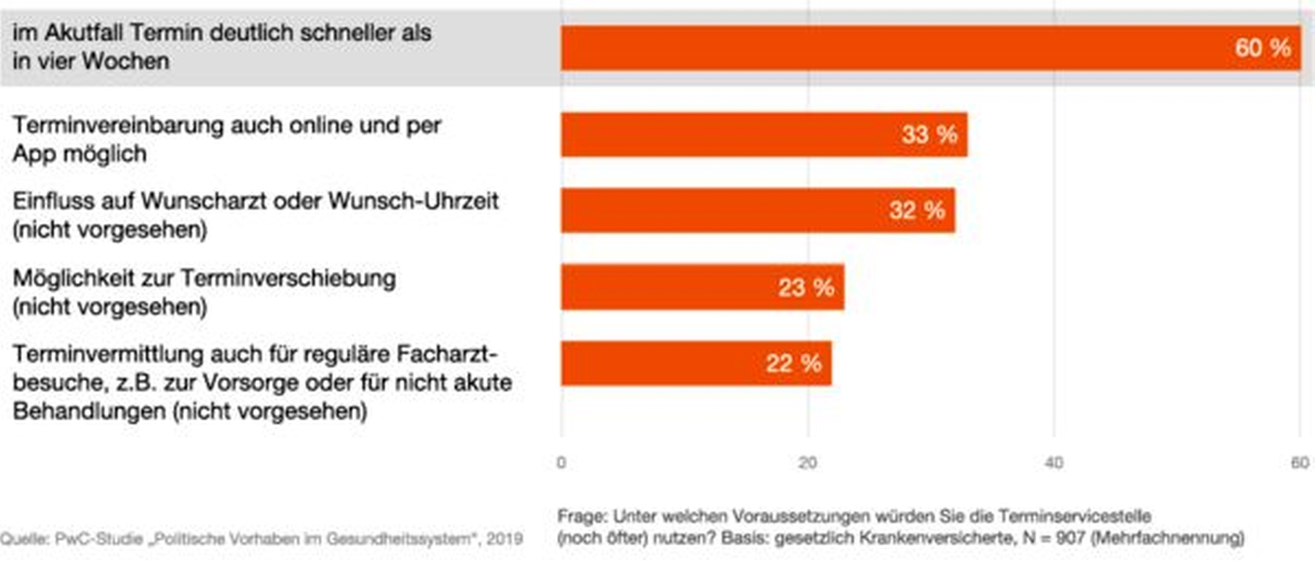 Terminservicestellen: 13 Prozent der Deutschen haben den Service genutzt, der einen schnellen Termin beim Facharzt gewährleisten soll und bislang bei den einzelnen Kassenärztlichen Vereinigungen angesiedelt war. Der Dienst wurde wenig angenommen, obwohl die Terminservicestellen bereits 71 Prozent der Bürger bekannt sind. Immerhin können sich in Zukunft 65 Prozent vorstellen, die zentrale Anlaufstelle für Patienten zu kontaktieren.