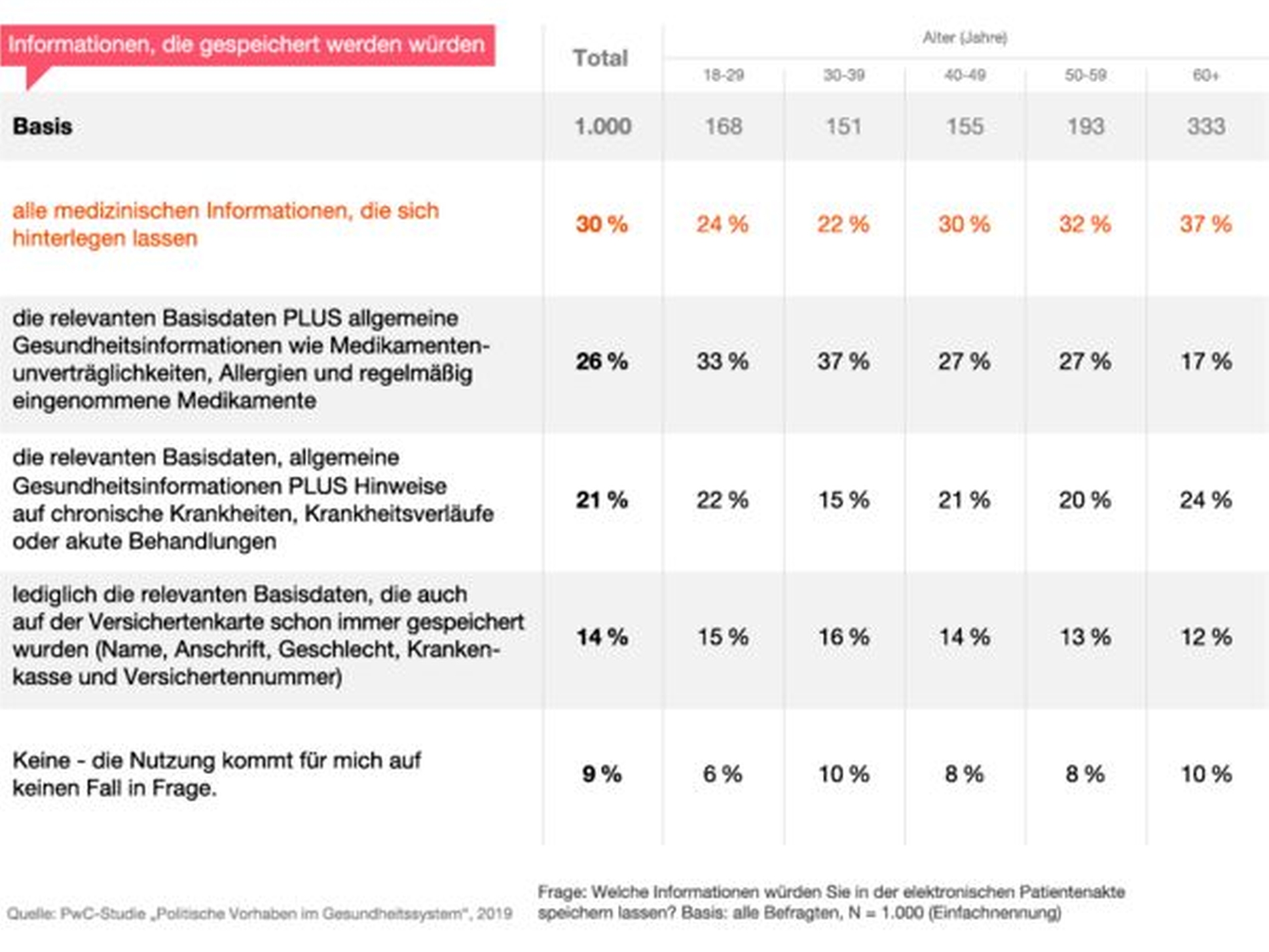 Digitalisierung und elektronische Patientenakte (ePA): Neun von zehn Deutschen sind bereit, für die ePA – ebenfalls Teil des TSVG – unter bestimmten Voraussetzungen ihre Daten preiszugeben. Etwa jeder Dritte kann sich sogar vorstellen, alle notwendigen medizinischen Informationen hinterlegen zu lassen. Andere schränken die Datenpreisgabe ein, etwa auf allgemeine Gesundheitsinformationen wie Medikamente, Allergien und Unverträglichkeiten (26 Prozent). Gänzlich lehnen nur neun Prozent der Befragten die ePA 44 Prozent bestätigen, wobei nur 26 Prozent selbst bestimmen möchten, wer welche Daten einsehen kann.