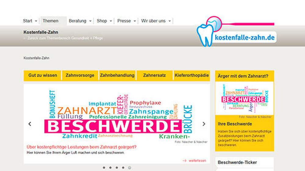 In einem Verbund wollen die Verbraucherzentralen Nordrhein-Westfalen, Rheinland-Pfalz und Berlin über die Themen Zahnersatz, Zahnbehandlung, KFO-Behandlungen sowie Kostenübernahmen der Krankenkassen informieren und gleichzeitig den Patienten eine Plattform für ihren Ärger bieten. Das PortalKostenfalle-Zahn.deversteht sich dabei explizit als „Informations- und Beschwerdeportal der Verbraucherzentralen“.