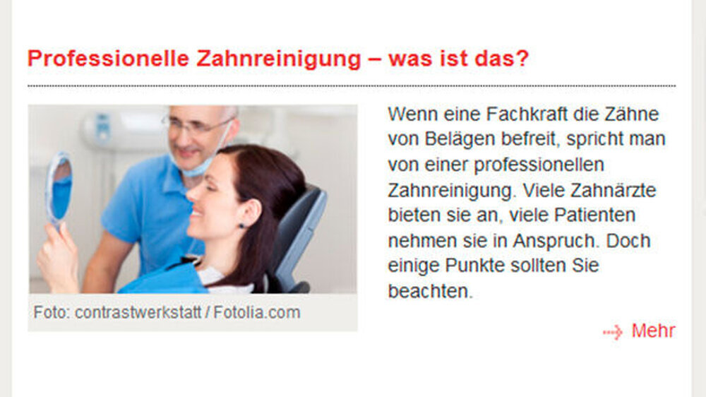 "Ansonsten sollte das neue Portal für die Vertragszahnärzteschaft aber kein Grund zur Aufregung sein, da dort grundsätzlich ja für Patienten wichtige Aspekte der zahnmedizinischen Versorgung abgebildet und zum Teil nützliche Hinweise gegeben werden", so Eßer, "erwähnt wird zum Beispiel das zahnärztliche Zweitmeinungsmodell, Kostenspannen bei der PZR unter der Quellenangabe "KZBV" sowie eine Verlinkung auf die Ergebnisse einer Umfrage der KZBV in Sachen PZR bei allen gesetzlichen Krankenkassen."