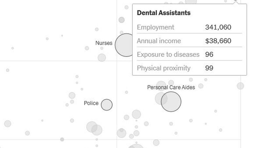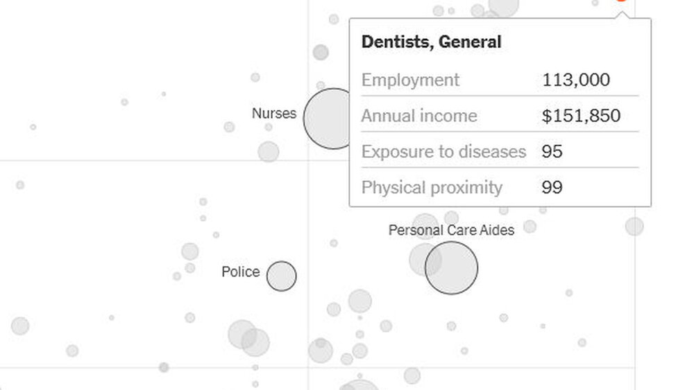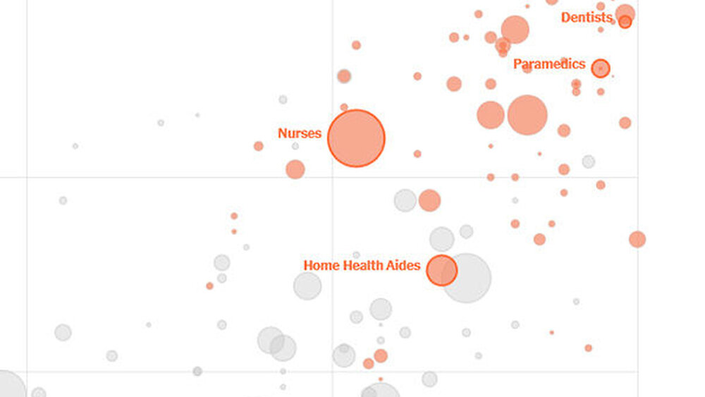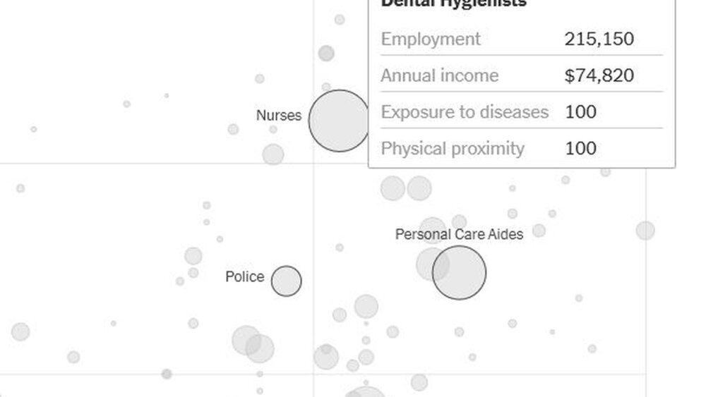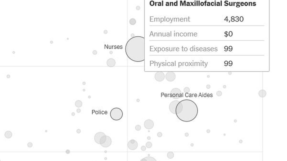 Für die interaktive Visualisierung hat die New York Times die Risikostufen verschiedener Arbeitsplätze auf Grundlage der Datenbank O*NET berechnet. Diese Datenbank