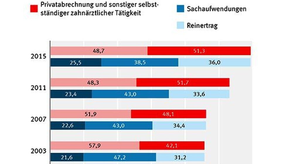 Mehr als die Hälfte der Einnahmen (51,3 Prozent) resultierte aus der privatzahnärztlichen Tätigkeit sowie aus sonstiger selbstständiger zahnärztlicher Tätigkeit. Die Aufwendungen betrugen in den Zahnarztpraxen im Jahr 2015 im Durchschnitt 380.000 Euro. Aus den durchschnittlichen Einnahmen und den Praxisaufwendungenlässt sich für das Jahr 2015 ein Reinertrag von 214.000 Euro je Zahnarztpraxis errechnen. Je Praxisinhaber liegt dieser Reinertrag bei 175.000 Euro.