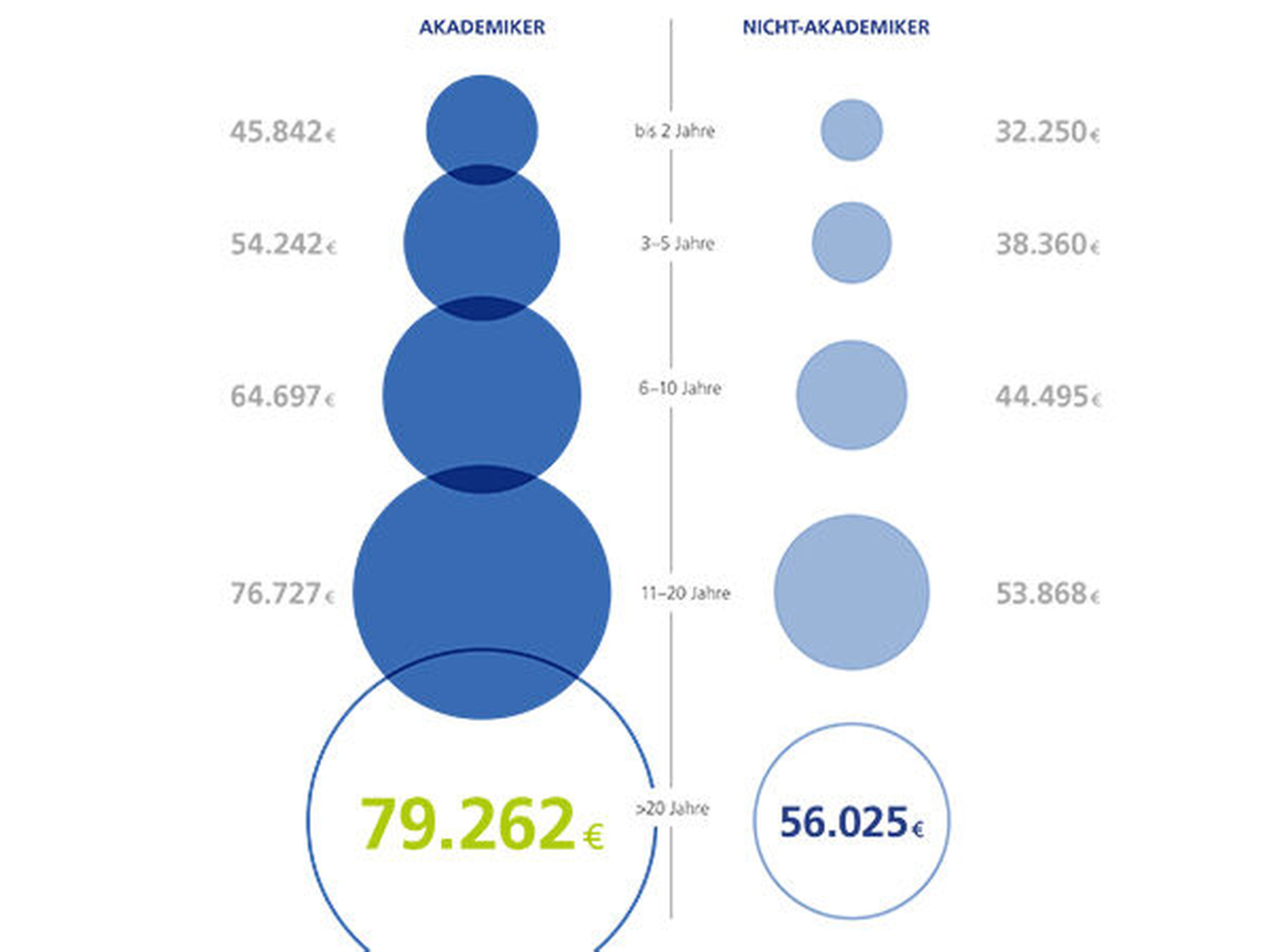 Zum anderen wird klar, dass Fachkräfte mit akademischer Ausbildung viel höhere Gehälter als Angestellte ohne Studienabschluss bekommen: