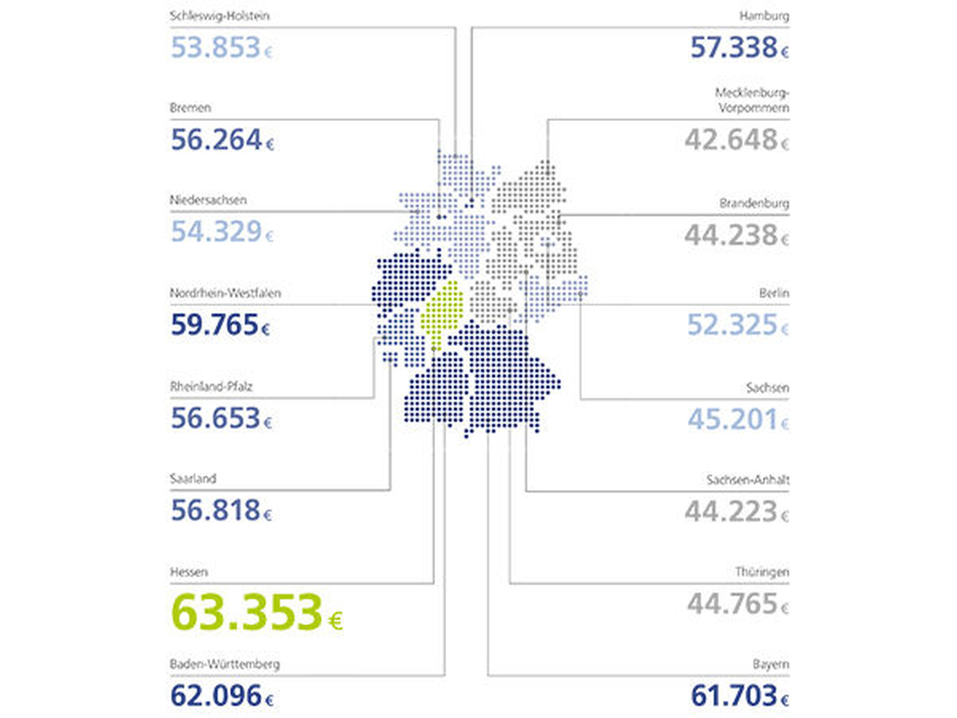 Im Vergleich der Bundesländer sichert sich Hessen Platz 1 - gefolgt von Baden-Württemberg und Bayern. In Brandenburg, Sachsen-Anhalt und Mecklenburg-Vorpommern verdienen Fach- und Führungskräfte im Schnitt am wenigsten: