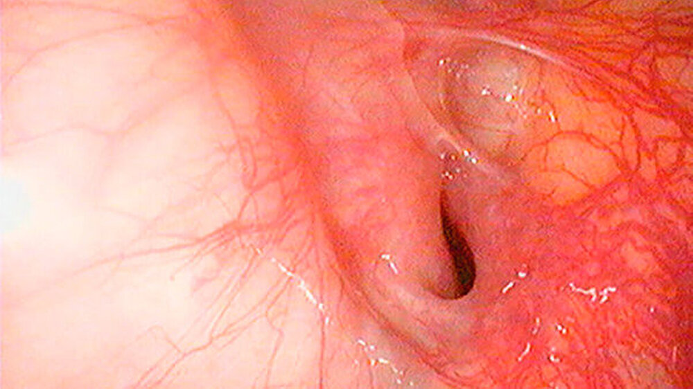Nach Abschieben des Mukoperiostlappens wurde der Knochen bis zur Schneider’schen Membran mittels Piezosurgery abgetragen. Es erfolgte ein Horizontalschnitt durch die Membran und damit die Eröffnung des Sinus maxillaris. Mittels eines flexiblen Endoskop konnte der Wurzelrest in regio des Ostium naturale visualisiert und mittels eines feinen Saugers adhäsiv aus der Kieferhöhle entfernt werden.