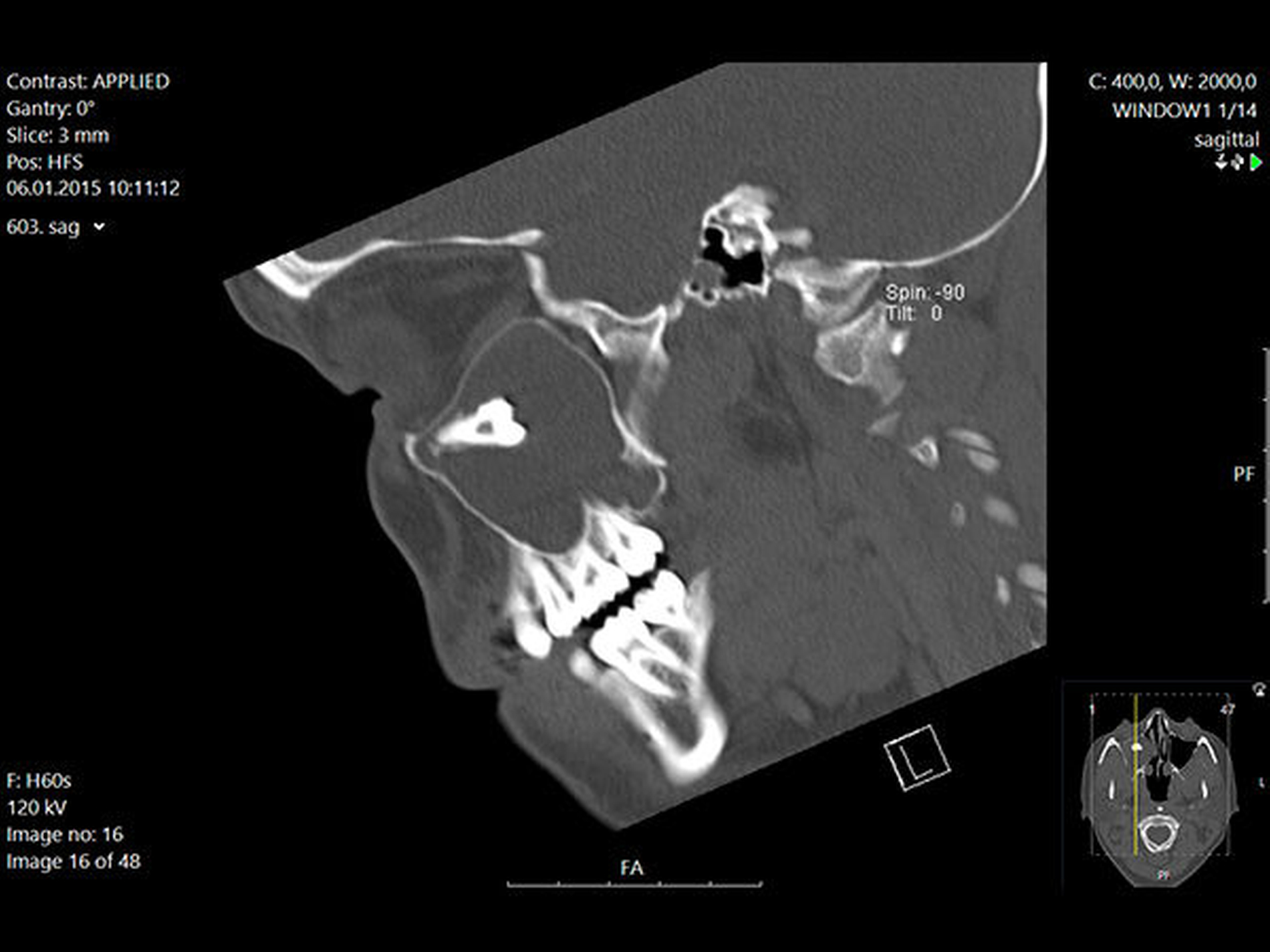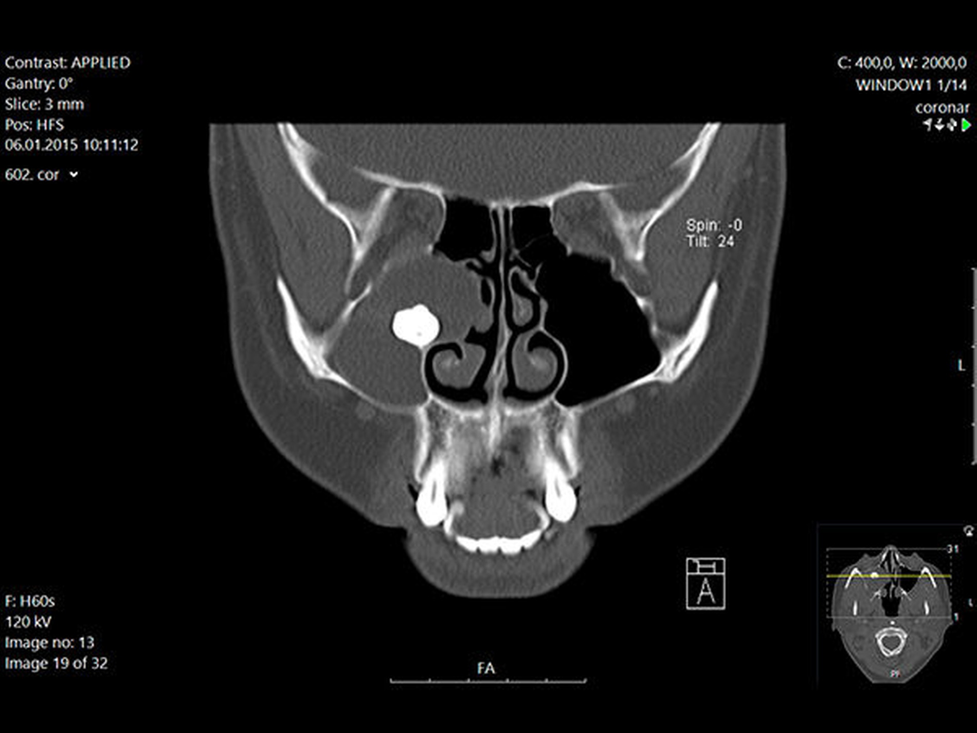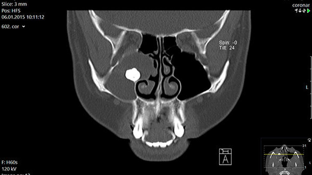 In der regionalen Klinik (Winterberg-Krankenhaus Saarbrücken) wurde zusätzlich eine kontrastmittelunterstützte Computertomografie der Nasennebenhöhlen durchgeführt (Abbildungen 2 und 3), die den Befund bestätigte und präzisierte.