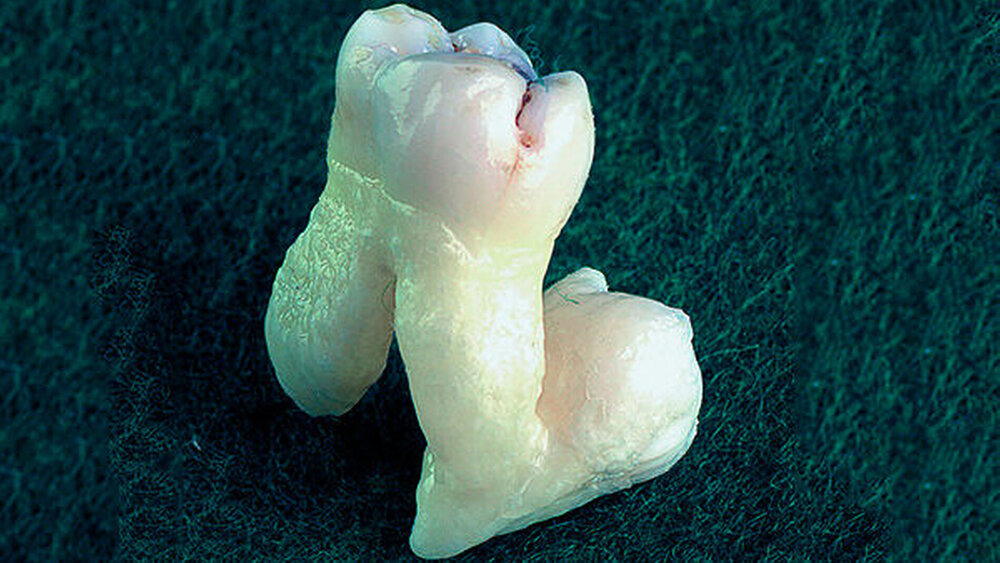 "Im letzten Jahr musste ich bei einer Patientin den oberen linken zweiten Molaren extrahieren. Ich hatte den Zahn schon ganz locker in der Zange, als ich bemerkte, dass da doch etwas Größeres sein musste. Ich glaubte zunächst an einen Tuber-Abriss. Nach Eröffnung der Schleimhaut mit dem Skalpell zeigte sich dann, was es war: Am 7er hing der 8er!"