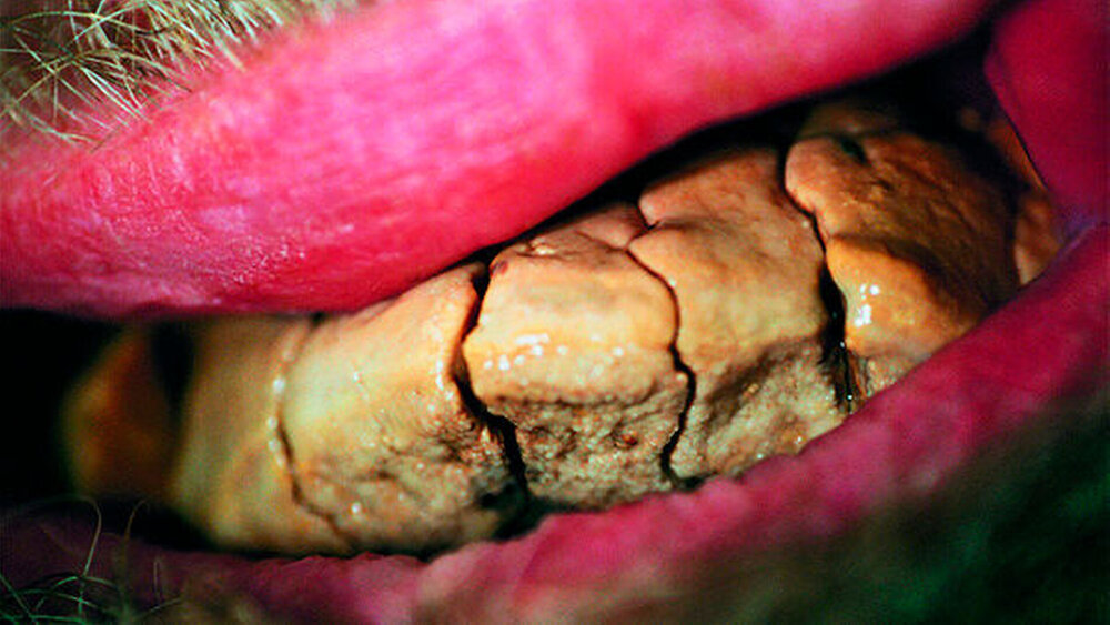 Die O1 ergab folgenden klinischen Befund: Oberkieferzähne fehlen, Unterkiefer 45 bis 34 vorhanden, Rest fehlt. Die vorhandenen Zähne hatten einen Lockerungsgrad III, waren jedoch durch Zahnstein zu einem grau-grünen Wall gleichsam verblockt. Diese hoch entzündliche, schaukelnde Kauleiste diente dem Patienten zur Nahrungszerkleinerung am Alveolarfortsatz im Oberkiefer. Offensichtlich sollte ein starker Oberlippenbart die ästhetischen Defizite kaschieren.