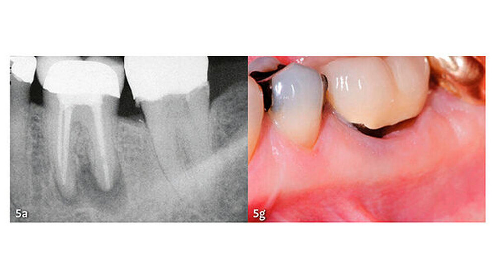 Die wesentlichen Daten von klinischen Studien über die Anwendung von MTA als retrogradem Füllmaterial sind in Tabelle III zusammengefasst. Die erste klinische Studie mit Auswertung der Erfolgsrate nach MTA-Anwendung in der apikalen Chirurgie wurde von Chong et al. (2003) publiziert - es war auch gleich die erste randomisierte Studie, welche MTA mit einem anderen retrograden Verschlusszement untersucht hat. Generell zeigen alle klinischen Studien sehr hohe Erfolgsraten für MTA in der apikalen Chirurgie (83,7% bis 96%). Die von uns 2014 publizierten Langzeitdaten (5 Jahre Beobachtungsdauer für alle behandelten Zähne) mit einer Erfolgsrate von 92,5% deuten auf eine sehr gute Stabilität und auf ein hohes Abdichtungsvermögen von MTA (von Arx et al. 2014) (Abb. 4 und 5).