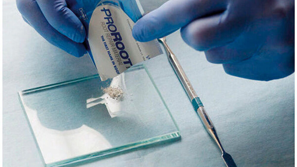 MTA wird mit sterilem Wasser idealerweise auf einer Glasplatte mit einem Spatel angemischt (Pulver-Flüssigkeitsverhältnis etwa 3:1). Die Flüssigkeit wird portionsweise unter das Pulver gemengt, bis eine cremigfeste Konsistenz erreicht ist (Abb. 1). Um sicherzustellen, dass alle Pulverbestandteile benetzt sind, sollte der Mischvorgang etwa eine Minute dauern. Pulver und Flüssigkeit bilden ein Kolloidgel, das in einem Zeitrahmen von ca. 3 Stunden aushärtet (Torabinejad et al. 1995a).