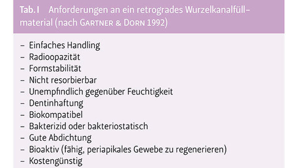 Die Anforderungen an ein retrogrades Füllmaterial sind deshalb vielfältig und hoch, ihre Erfüllung entscheidet über den Langzeiterfolg nach apikaler Chirurgie (Tab. I). Prinzipiell werden Füllmaterialien, welche für die restaurativ konservierende Zahnmedizin entwickelt wurden, früher oder später auch in der apikalen Chirurgie als retrograde Verschlussmaterialien verwendet (Amalgam, Komposit, Glasionomerzement, Zinkoxid-eugenol-basierte Zemente wie IRM und SuperEBA etc.). Von den erwähnten Materialien haben allerdings nur IRM und SuperEBA eine breite Anwendung erfahren. Auch spezifisch für die apikale Chirurgie entwickelte Titan- oder Aluminiumoxid-Stifte konnten sich nie durchsetzen, da sie in keiner Art und Weise der komplexen Wurzelkanalanatomie an der Resektionsfläche entsprechen.