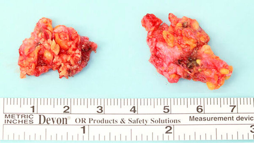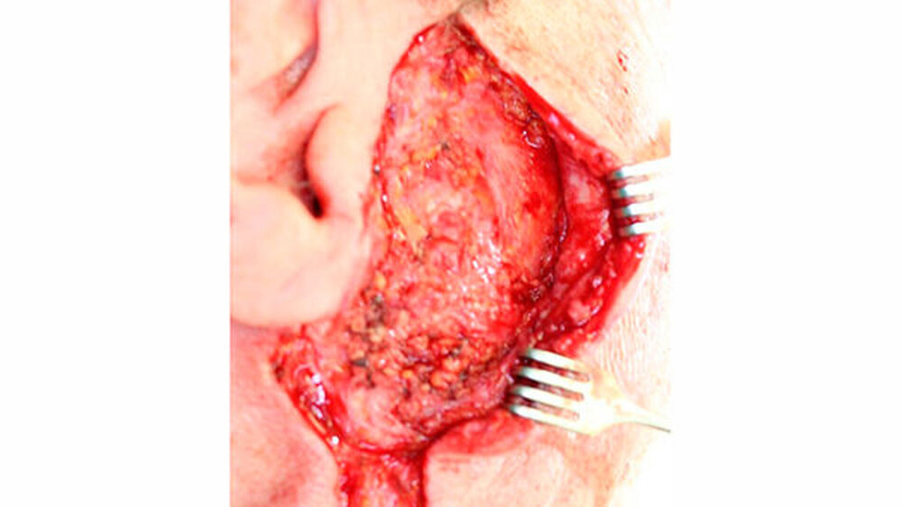 Es wurde die erneute OP-Indikation zur Vergrößerung des Sicherheitsabstandes im Sinne einer partiellen Parotidektomie sowie einer prophylaktischen ipsilateralen Neck dissektion der Level I und II gestellt (Abbildung 3). Abbildung 4 zeigt das Nachresektat. Postoperativ lag kein Hinweis auf eine Schädigung des N. facialis vor. Bei sanatio per primam intentionem entließen wir den Patienten am fünften postoperativen Tag in die ambulante Nachsorge. Die abschließende Histologie ergab weder Residuen des resezierten myoepithelialen Karzinoms noch einen Lymphknotenbefall (TNM-Klassifikation (8. Auflage): pT2, pN0 (0/9), G3, R0).