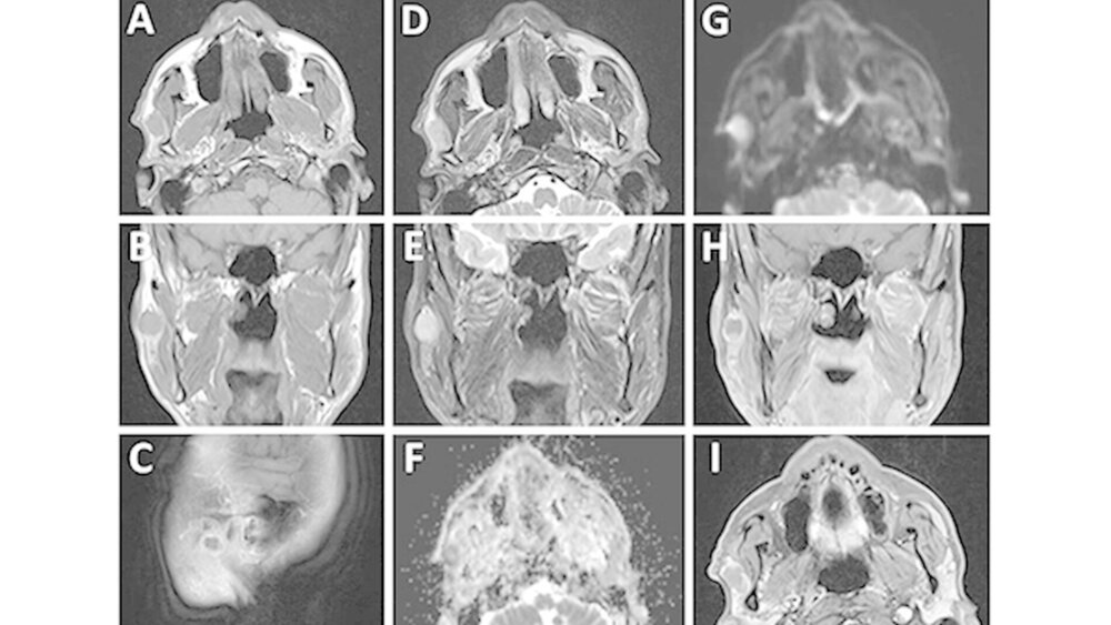 Klinisch wurden keine sensomotorischen Ausfälle im Gesichtsbereich festgestellt. Palpatorisch fand sich eine haselnussgroße, nicht schmerzhafte, bedingt verschiebliche Raumforderung im Bereich der rechten Gl. parotis. Eine B-Symptomatik wurde vom Patienten verneint. Die manuell provozierte Salivation aus dem rechten Stenon-Gang war spontan klar flüssig. Sonografisch zeigte sich ein kreisrunder homogener, im zentralen Drüsengewebe integrierter Tumor mit einem Durchmesser von etwa 18 mm. Zervikal vergrößerte Lymphknoten waren nicht darstellbar. Zur weiteren Abklärung eines möglichen Zystadenoms erfolgte die Anfertigung eines Hals-MRT mit Kontrastmittel. Das angefertigte MRT ergab eine scharf begrenzte zentrale Raumforderung der rechten Gl. parotis mit einer Ausdehnung von 18 mm x 10 mm, die sich zum angrenzenden Muskelgewebe in der T1-Gewichtung hypointens (Abbildung 1A bis 1C) sowie in der T2-Gewichtung leicht hyperintens (Abbildung 1D und 1E) darstellte.