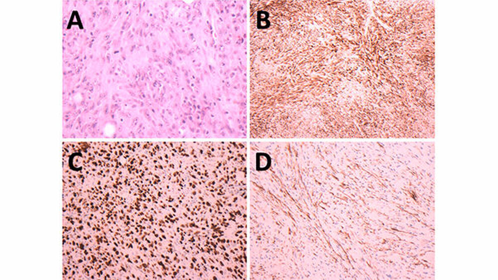 Der ADC-Wert (apparent diffusion coefficient-Wert) war deutlich vermindert (Abbildung 1F und 1G). Die Kontrastmittel gestützten Sequenzen wiesen lediglich eine dezente randständige Anreicherung auf (Abbildung 1h und 1l). Pathologisch veränderte Lymphknoten waren nicht nachweisbar. Im MRT wurde zunächst der Verdacht eines Warthin-Tumors geäußert. Nach Resektion der tumorösen Raumforderung unter Schonung des Plexus parotideus ergab das histologische Ergebnis ein in sano reseziertes, stark proliferierendes, maximal 2,5 cm großes, myoepitheliales Karzinom von insgesamt spindelzellig-mesenchymalem Aspekt (Abbildung 2a) mit einem minimalen Sicherheitsabstand von 0,1 mm (TNM-Klassifikation (8. Auflage): pT2, G3, R0). Immunhistochemisch wurde eine intensive Expression von Zytokeratin 18 (CK18; Abbildung 2b) sowie eine intensive Kernmarkierung mit Ki-67 nachgewiesen (Abbildung 2c). Zusätzlich fand sich eine fokale Expression von glattmuskulärem Aktin (Abbildung 2d) und Desmin.