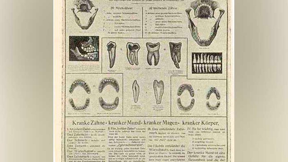 In der Folgezeit kam es zur Vermittlung von entsprechendem Inhalten durch Vorträge vor Lehrerkonferenzen, Elternversammlungen oder Vereinen sowie die Verteilung von Merkblättern für Eltern und Kinder. Die hygienische Volksbelehrung griff ebenfalls auf Visualisierungsstrategien zur Vermittlung von Wissen durch Bilder zurück [Rittershaus, 2013:3]. Ein Beispiel für diese Variante von Wissensvermittlung bildete die von dem Straßburger Privatdozenten für Zahnheilkunde Ernst Jessen (1859–1933) und dem Pädagogen und Publizisten Bruno Stehle (1852–1932) entwickelte Schulwandtafel (Abbildung 1) [Hideharu, 2011:224].