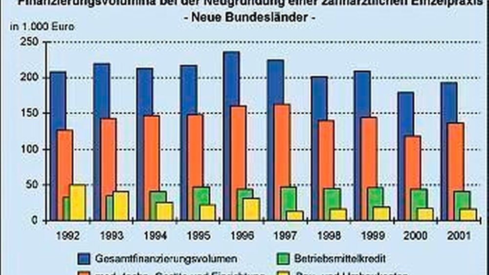 Eine Praxisübernahme in den neuen Bundesländern erforderte 2001 ein Gesamtfinanzierungsvolumen von 195 000 Euro und lag damit erneut leicht über dem Investitionsvolumen einer Praxisneugründung. Das Ost/West-Verhältnis der Investitionsvolumina für eine Praxisübernahme sank im Jahr 2001 um drei Prozentpunkte auf 74 Prozent. Im Jahr 2001 lag der Betriebsmittelkredit einer Einzelpraxisneugründung in den neuen Bundesländern mit 40 000 Euro etwa zehn Prozent unter dem Wert des Vorjahres. Bei der Übernahme einer Einzelpraxis betrug der Betriebsmittelkredit unverändert 37000 Euro. Bauinvestitionen schlugen in den neuen Bundesländern bei einer Praxisneugründung mit 16 000 Euro zu Buche. Bei der Praxisübernahme fielen die baulichen Investitionen mit rund 4 000 Euro kaum noch ins Gewicht.