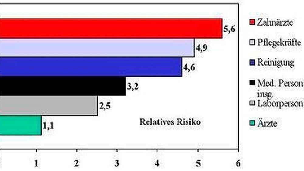 In einer Untersuchung in Freiburg [20] wurde bei 245 Probanden mit erhöhten Transaminasen der Anti-HCV-Serostatus erhoben (Abbildung 2). In 22 Fällen (neun Prozent) zeigte sich ein positives Ergebnis, wobei Angehörige des medizinischen Bereiches überwogen. Während unter den 163 Beschäftigten aus medizinischen Abteilungen 19 anti-HCV-positiv waren (11,6 Prozent), fand sich bei nur bei drei der 82 nicht im medizinischen Bereich tätigen Personen ein derartiges Ergebnis (3,6 Prozent). In dieser Studie wurde im Vergleich zu den Beschäftigten im nicht-medizinischen Bereich (Äquivalent für die „Allgemeinbevölkerung“) ein 3,2-fach erhöhtes Risiko für Anti-HCV-Seropositivität für Beschäftigte im medizinischen Bereich und ein 5,6fach erhöhtes Risiko für Beschäftigte in der Zahnmedizin ermittelt (p < 0,05).