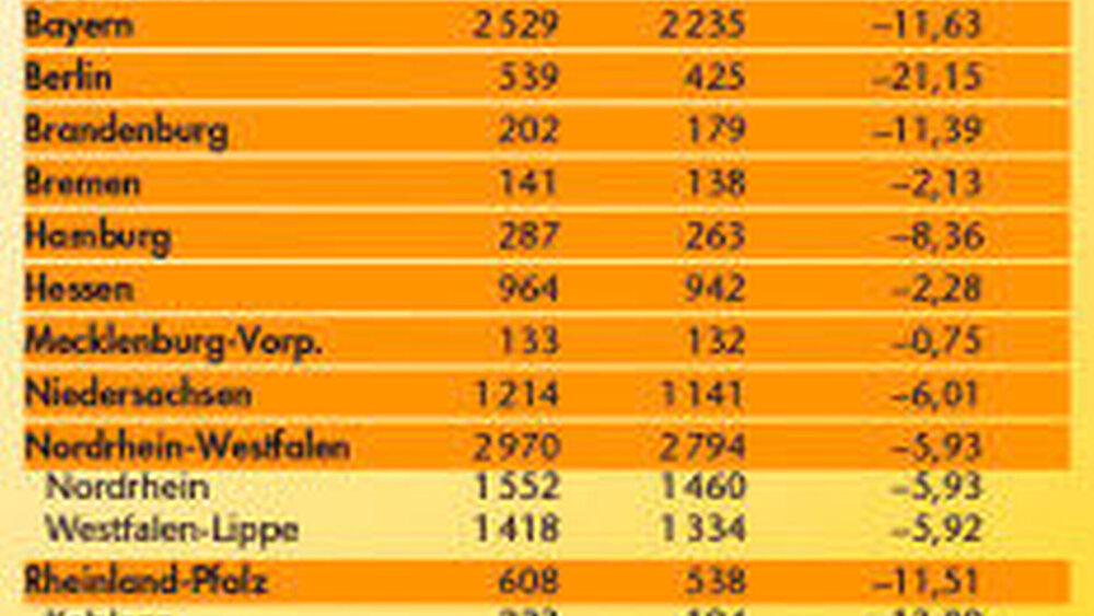 Alle Kammern haben einen Rückgang der Ausbildungszahlen gegenüber dem Vorjahr zu verzeichnen, wobei die Zahlen einzelner Kammerbereiche zum Teil erheblich um den Durchschnittswert variieren. Weitgehend stabile Werte bei den neuen Ausbildungsverhältnissen finden sich lediglich in Bremen, Hessen und Mecklenburg-Vorpommern. Deutliche prozentuale Verluste verzeichneten hingegen Berlin, Sachsen, Schleswig-Holstein, Sachsen-Anhalt, Bayern, Rheinland-Pfalz und Brandenburg (siehe Tabelle 1).