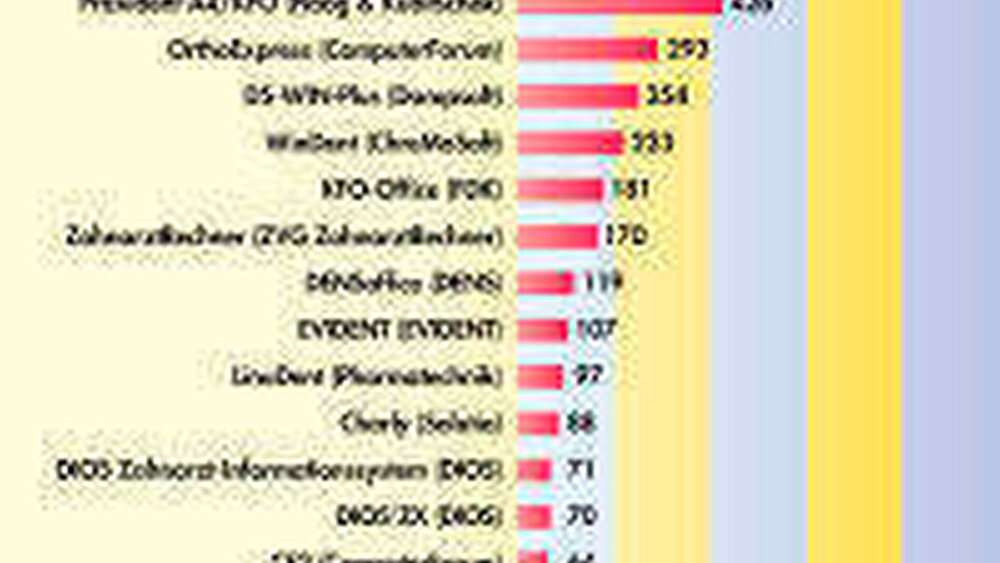 In der Kieferorthopädie hat das Programm KFO-Win der Firma Computer konkret zugelegt. So wurden im letzten Quartal vergangenen Jahres 17,4 Prozent aller per Datenträger eingereichten Abrechnungen mit diesem System erstellt. Das Programm Z1 (CompuDENT Z1) liegt mit einer Abrechnung weniger fast gleich. Zusammen mit dem Abrechnungsprogramm Praxident A4/KFO der Firma Haag & Kubitschek (10,7 Prozent) erstellten diese drei Systeme 45,5 Prozent aller per Datenträger eingereichten Abrechnungen.