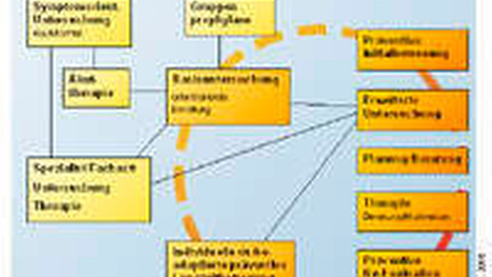 Diese Präventionsorientierung findet ihren Niederschlag in besonderem Maße in der Systematik (Abbildung 4) der präventionsorientierten Neubeschreibung der Zahn-, Mund- und Kieferheilkunde hinsichtlich der Abfolge von Diagnostik, Therapie und Recall. Dieses System verfolgt das Ziel, möglichst frühzeitig und möglichst lückenlos den individuellen Betreuungs- und Behandlungsbedarf festzustellen, eine entsprechend risikoorientierte, minimalinvasive und schadensgerechte Therapie durchzuführen und nachfolgend individuell eine risikoadaptierte präventive Langzeitbetreuung zur Erhaltung des Therapieergebnisses zu veranlassen.