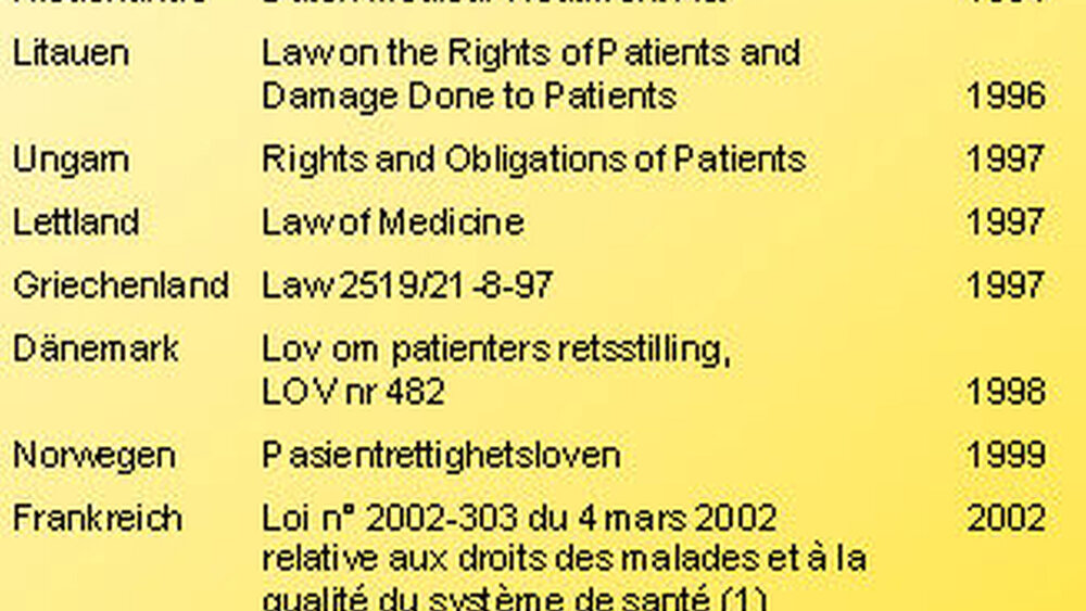 Andere europäische Länder sind da schon weiter. Die Finnen zum Beispiel können sich bereits seit 1992 auf ein Patientenrechtsgesetz berufen. Die Niederlande, Litauen, Ungarn, Lettland, Griechenland, Dänemark und Norwegen verfügen ebenfalls seit den 90er Jahren über spezielle Gesetze zum Schutz der Patienten. Belgien, Frankreich und Estland zogen im Jahr 2002 nach. Die zypriotische Regierung wiederum erließ im vergangenen Jahr ein eigenständiges Patientenrechtsgesetz. Die übrigen EU-Länder stützen sich in der Regel auf rechtlich unverbindliche Patientencharten.
