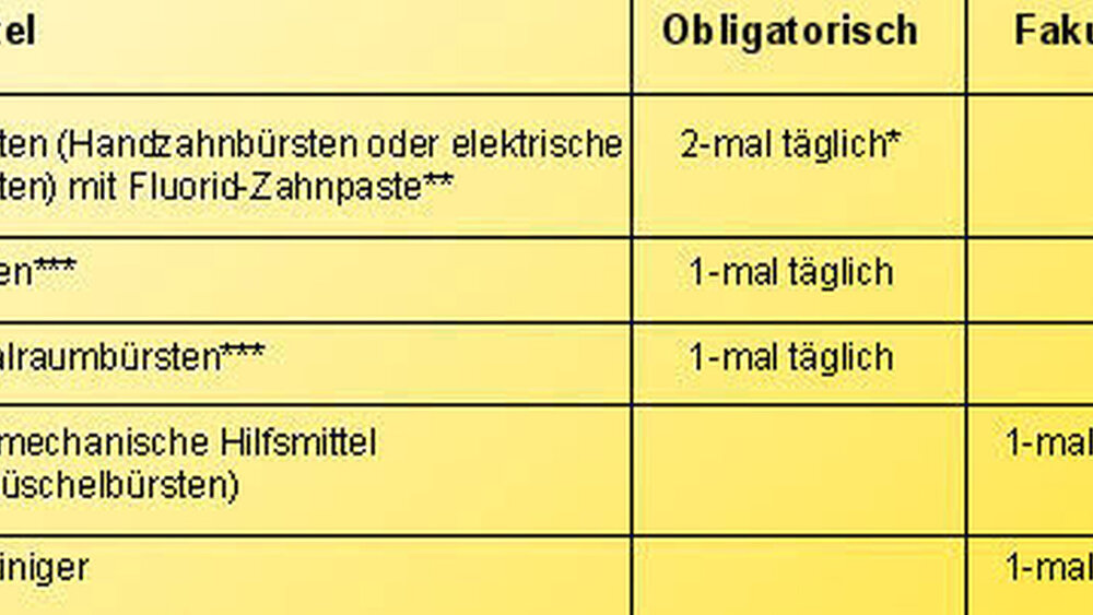 Eine große Zahl von Autoren hält es für angemessen, wenn zweimal am Tag die Zähne geputzt werden [1, 11, 14]. Die American Dental Association (ADA) empfiehlt ebenfalls ein zweimal tägliches Zähneputzen mit der Zahnbürste, davon einmal täglich in Kombination mit Zahnseide beziehungsweise Interdentalraumbürsten [3]. Eine Zungenreinigung einmal pro Tag kann Mundgeruch reduzieren.