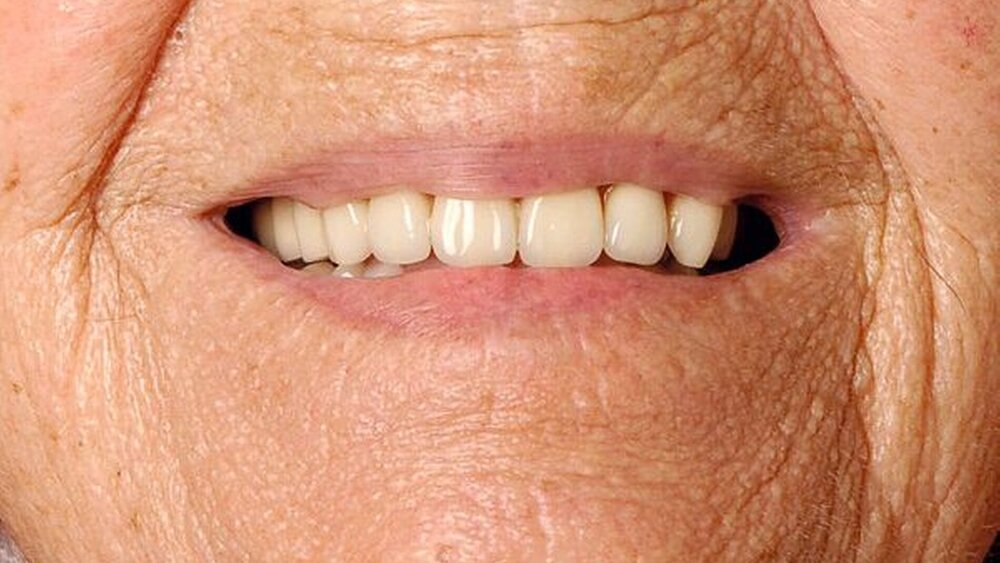 Abschließend wurde der Sitz der Prothese mit einem Fließsilikon überprüft (Fit checker, GC, Tokio, Japan) und die Patientin in die Handhabung und Pflege der Unterkieferprothese und des Kugelkopfes eingewiesen. Die äußerst zufriedene Patientin (Abbildung 14) wurde in das Nachsorgeprogramm der Klinik aufgenommen.