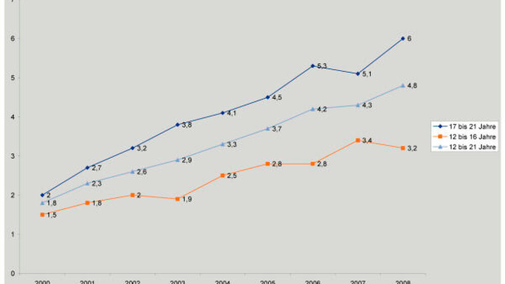 Dem Archiv des Statistische Bundesamtes in Wiesbaden (Destatis) ist zu entnehmen: „Im Jahr 2008 wurden rund 25 700 Kinder, Jugendliche und junge Erwachsene zwischen zehn und 20 Jahren aufgrund akuten Alkoholmissbrauchs stationär im Krankenhaus behandelt.“ Weit mehr Menschen, als eine Kleinstadt Einwohner hat. Und ein Anstieg von elf Prozent gegenüber 2007. Im Milleniumsjahr waren es „lediglich“ 9 500 Patienten. Auffällig ist: Bei den Jugendlichen und jungen Erwachsenen im Alter von 15 bis unter 20 Jahren wurden mehr Männer (64 Prozent) behandelt. Dagegen dominierten bei den Patienten im Alter von 10 bis unter 15 Jahren die Mädchen (53 Prozent), obwohl ihr entsprechender Anteil an der Bevölkerung nur 49 Prozent beträgt.