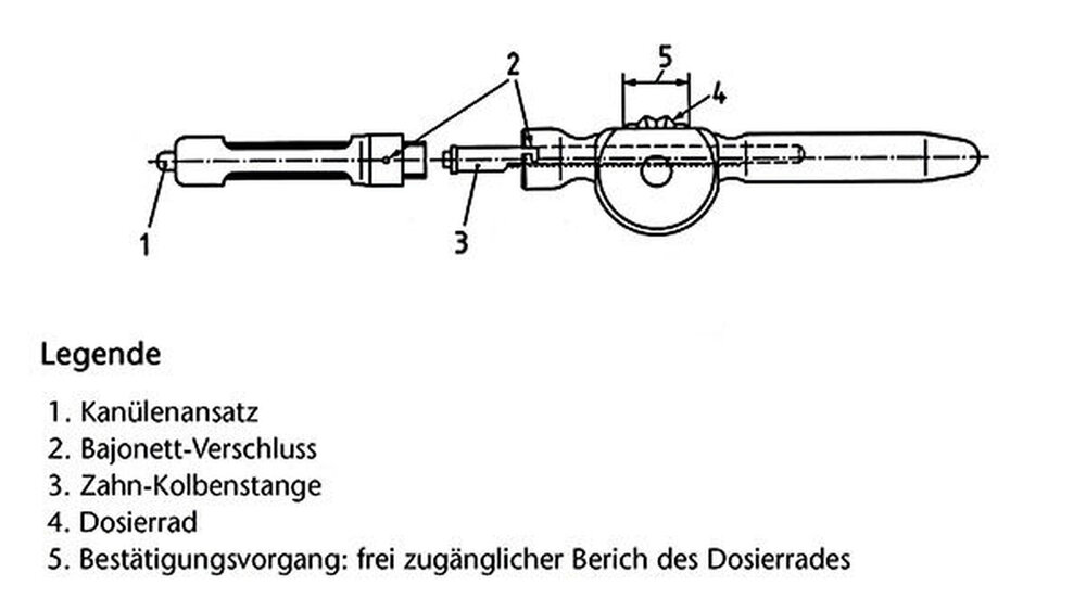 Für die intraligamentäre Anästhesie darf das Dosierradspritzensystem nur zusammen mit Kanülen verwendet werden, deren Außendurchmesser maximal 0,3 mm beträgt. Der Spritzenkörper muss das Beladen mit einer Zylinderampulle, die DIN EN ISO 11499 entspricht, ermöglichen, das heißt, es müssen handelsübliche Anästhetikum-Zylinderampullen bis maximal 1,8 ml verwendet werden können.