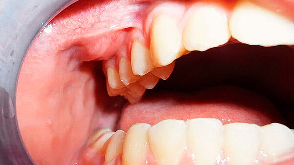 Inspektorisch waren eine dezente extraorale sowie eine deutlichere enorale Schwellung sichtbar (Abbildung 1). Die Raumforderung bestand eigenanamnestisch seit einigen Wochen und hatte eine Größe von etwa 1,5 cm x 2 cm. Sie war verschieblich und fest. Funktionell lagen keine Einschränkungen vor, ebenso kam es zu keinen sensiblen Ausfällen.