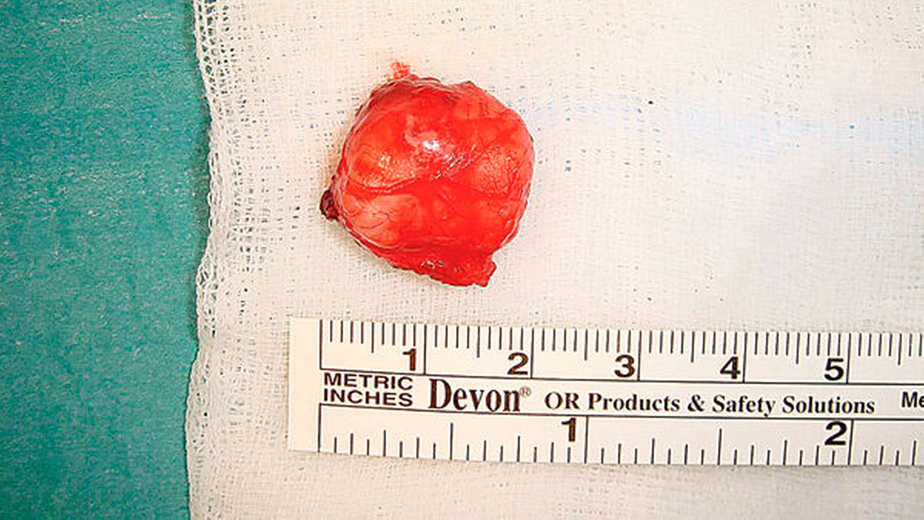 Neben der Sonografie zeigte eine MRT-Untersuchung (Abbildung 2) rechts lateral des Oberkiefers, auf Höhe regio 14 und kaudoventral des rechten Sinus maxillaris, eine in der T2-Wichtung hyperintense, glatt berandete Raumforderung von circa 11 mm x 18 mm Größe. In der Panoramaschichtaufnahme wurden keine weiteren dentalen oder knöchernen Pathologien erhoben. In Intubationsnarkose erfolgte über einen enoralen Zugang die Exstirpation der Raumforderung in toto (Abbildung 3).