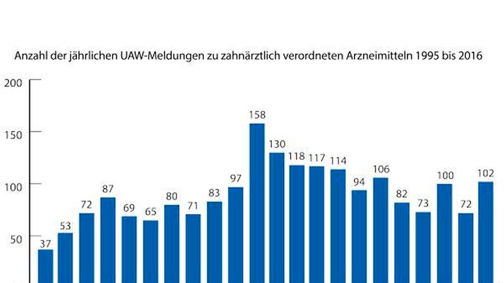 Der prozentuale Anteil an UAW-Meldungen zu Analgetika lag im Jahr 2016 bei 5 Prozent und bleibt somit auf dem seit 2014 beobachteten insgesamt niedrigen Niveau. Ibuprofen ist nach Verordnungszahlen mit Abstand das am häufigsten zahnärztlich eingesetzte Analgetikum. Die vier Meldungen zu Ibuprofen in Form von allergischen Unverträglichkeitsreaktionen, teilweise mit Kreislaufreaktion, Exanthem, Lippen- und Halsschwellung waren nach Absetzen des Präparats allesamt reversibel und liegen im zu erwartenden Nebenwirkungsspektrum der Substanz. In einem Fall wurde unter Einnahme von Dexketoprofen über Schlaflosigkeit, Rückenschmerzen und einen erhöhten Harndrang berichtet. Schlaflosigkeit wird gelegentlich unter Einnahme von Dexketoprofen beschrieben. Bezüglich der pharmakodynamischen Wirksamkeit von Dexketoprofen bei Zahnschmerzen ist festzustellen, dass in der wissenschaftlichen Literatur weder Wirksamkeits- noch Verträglichkeitsvorteile zugunsten von Dexketoprofen gegenüber Standardanalgetika beschrieben werden. Insgesamt verursachte die zahnärztliche Therapie mit Analgetika kaum Komplikationen. Die insgesamt weiter abnehmende und auch absolut extrem geringe Zahl an UAW-Meldungen zu dieser Arzneimittelgruppe spricht für einen insgesamt sicheren Umgang der Zahnärzteschaft mit Analgetika.