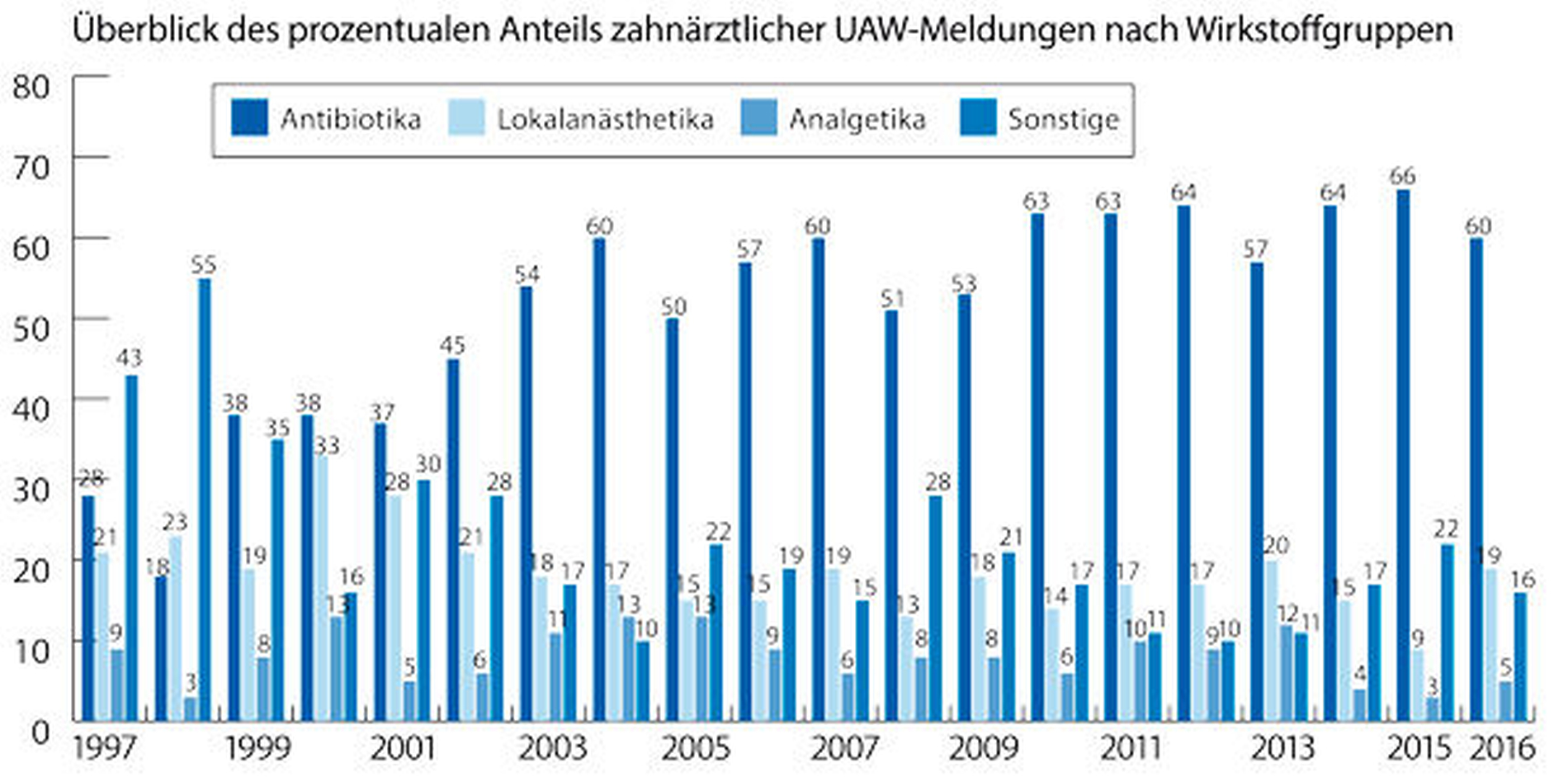 Andere Antibiotika spielten auch im Jahr 2016 (zusammen insgesamt n = 4 (6 Prozent)) wie in den Vorjahren in der zahnärztlichen UAW-Statistik praktisch keine Rolle.