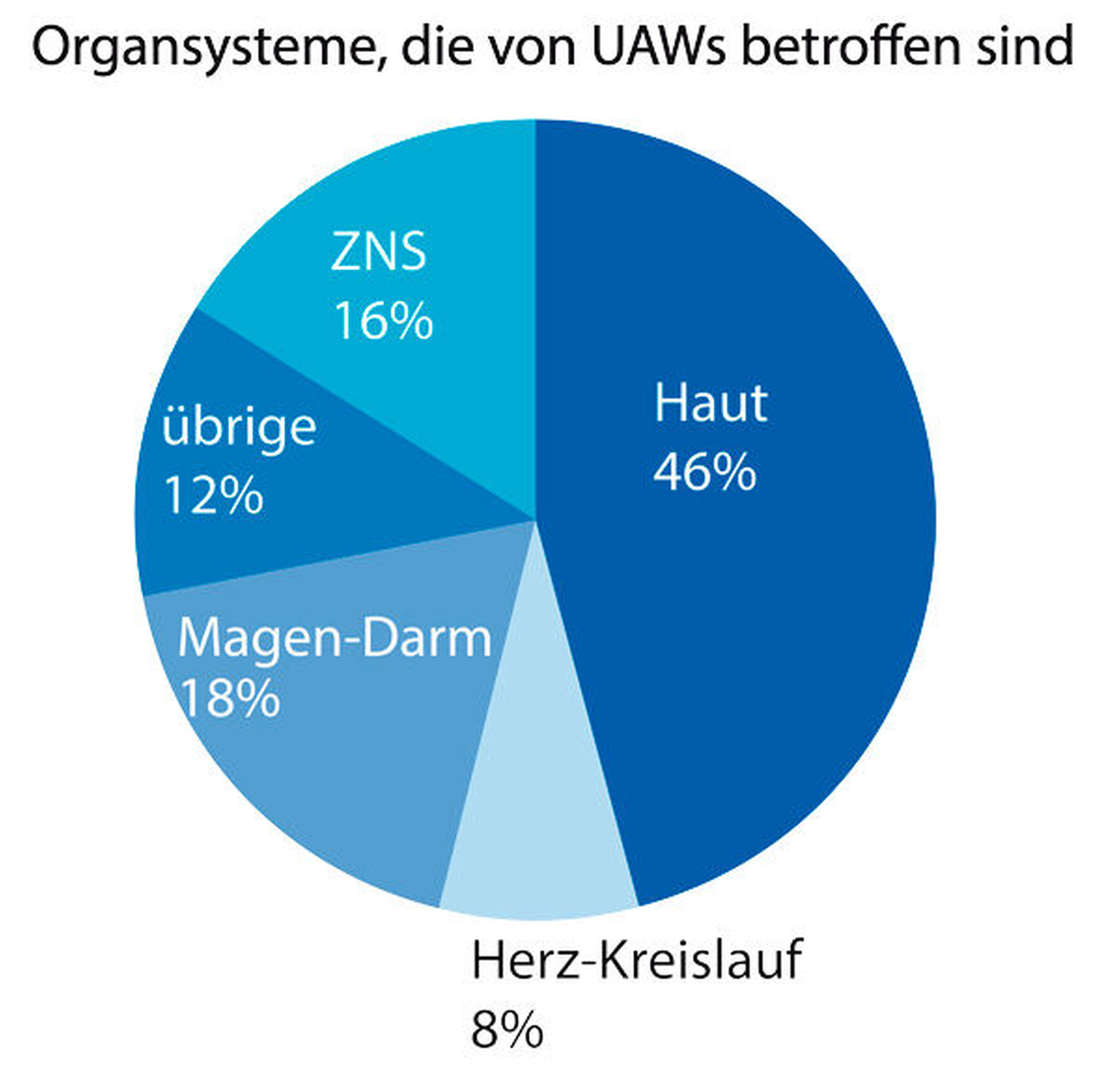 Die mit Abstand meisten der gemeldeten unerwünschten Arzneimittelwirkungen im Jahr 2016 manifestierten sich mit 46 Prozent an Haut und Schleimhäuten, meist in Form von allergischen Exanthemen, Urtikaria, Schwellungen, Juckreiz und Ödemen. Mit 18 Prozent am zweithäufigsten manifestierten sich UAWs am beziehungsweise im Gastrointestinaltrakt in Form von Bauchschmerzen, Übelkeit und Diarrhoe (Abbildung 3). Beeinträchtigungen des Gastrointestinaltrakts wurden hauptsächlich im Zusammenhang mit Antibiotikatherapie und hier insbesondere unter Behandlung mit Amoxicillin und Clindamycin beobachtet. Leider ist das gastrointestinale Verträglichkeitsprofil von Amoxicillin nur unwesentlich besser als das von Clindamycin. Um die gastrointestinale Verträglichkeit zu verbessern, sollte die Einnahme der Medikation mit ausreichend Flüssigkeitszufuhr (mindestens 200 bis 250 ml Wasser) und zu den Mahlzeiten erfolgen. Über ZNS-Störungen wurde 2016 in 16 Prozent der Fälle berichtet, wobei diese am häufigsten im Zusammenhang mit Lokalanästhetika beziehungsweise antibiotischer Therapie beschrieben wurden. Während unter Therapie mit Lokalanästhetika meistens eine relative Überdosierung ursächlich für zentralnervöse Nebenwirkungen ist, können Antibiotika per se neurotoxische Nebenwirkungen verursachen, die häufig fehlgedeutet werden. Während Penicilline, Cephalosporine und Chinolone hauptsächlich über eine Inhibition der GABAA-Rezeptoren neurotoxisch wirken, ist der Mechanismus für Metronidazol, Makrolide, Clindamycine und Tetrazykline weitgehend ungeklärt [Stahlmann, 2016]. Vorhandene neuropsychiatrische Grunderkrankungen, eine entsprechende Begleitmedikation sowie eine vorhandene Niereninsuffizienz bei renal eliminierten Antibiotika sind als zusätzliche Risikofaktoren anzusehen. Eine Beachtung dieser Gegebenheiten kann zu einer insgesamt besseren Verträglichkeit der Antibiotikatherapie beitragen. Unerwünschte Herz-Kreislauf-Effekte machten 2016 nur einen Anteil von acht Prozent am Gesamtanteil aller UAW-Meldungen aus, wobei Kreislaufprobleme öfter im Zusammenhang mit der Anwendung von Antibiotika gesehen wurden und am ehesten im Zusammenhang mit therapiebedingten Durchfällen und entsprechenden Flüssigkeitsverlusten zu interpretieren sind.