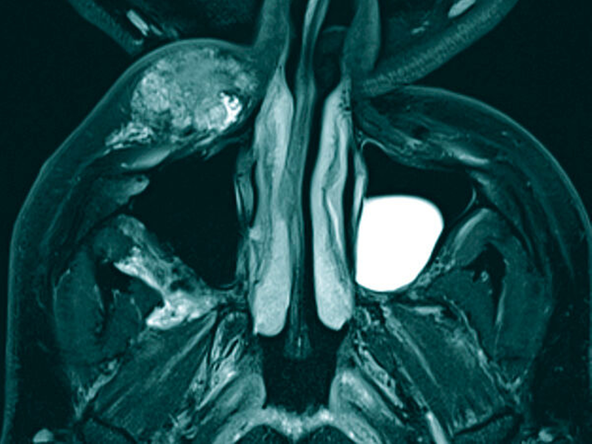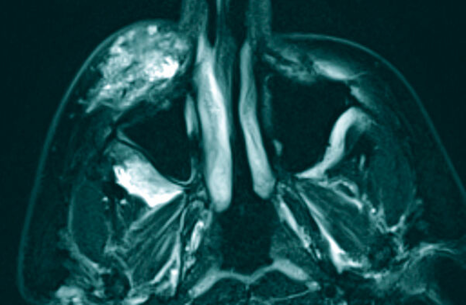 Zur Beurteilung der Befundausdehnung und zur Planung der Therapie wurde präoperativ eine Magnetresonanztomografie (MRT) des Schädels angefertigt (Abbildung 2). Hier zeigte sich die bekannte vaskuläre Malformation der rechten Wange mit Ausläufern nach intraorbital, in die Fossa pterygopalatina und infratemporalis. Im Vergleich zu den Voraufnahmen zeigte sich eine geringe Größenprogredienz des extraorbitalen Befunds (Abbildung 3).